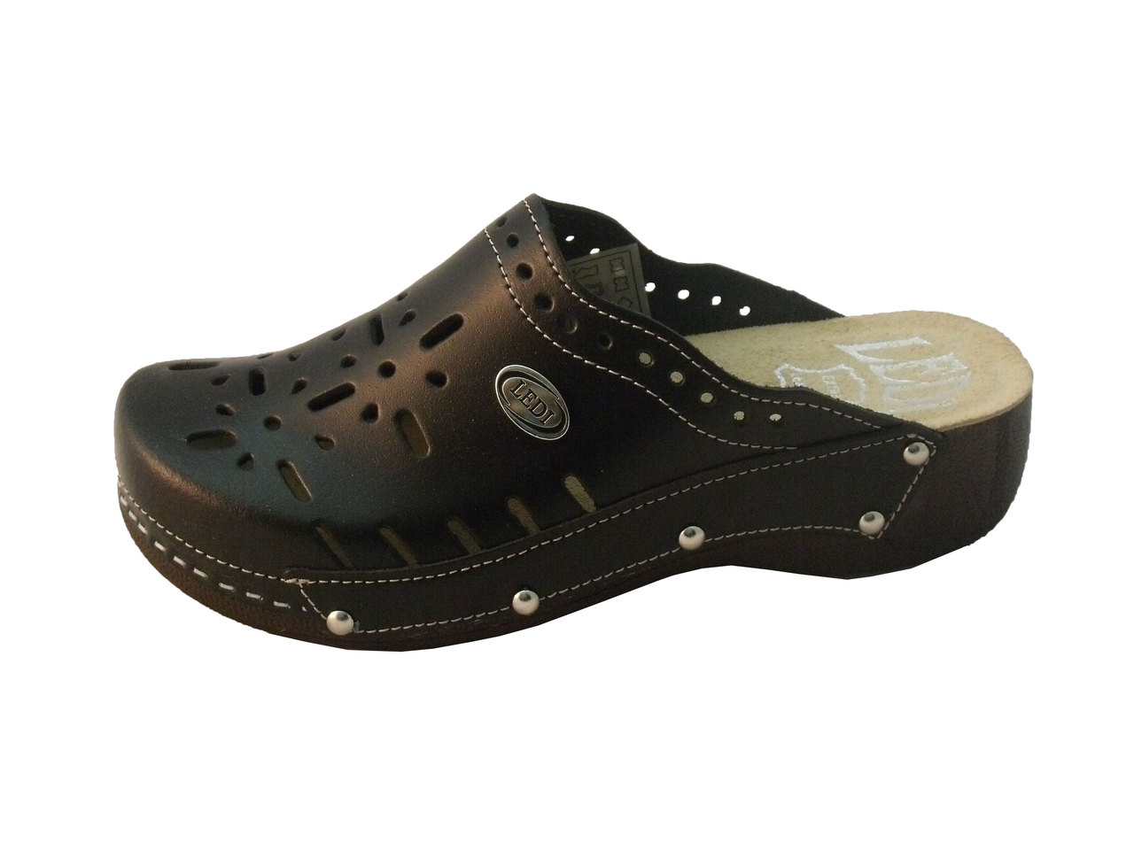 Orthopädische Clogs für Damen, perforiertes Echtleder, schwarze Farbe, harte Einlage, wodurch die Fußsohle die von der Sohle bestimmte Linie annimmt, mit leichtgewichtiger Schuhsohle aus Polyurethan 4 cm hoch.